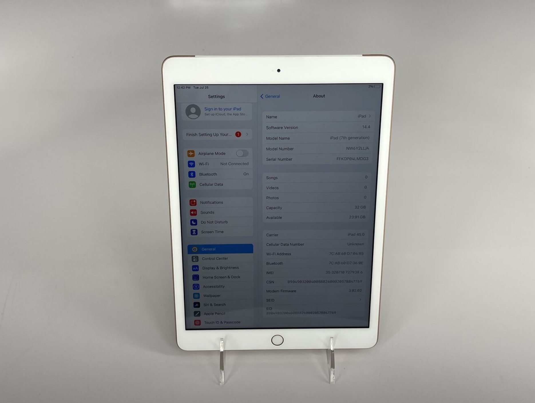 Here we have an iPad 7th Generation that has been very well maintained. It terms of cosmetics there are few flaws, those being scratching from general use, and light markings from being housed in a protective case. The battery has a charging capacity of 100%. It has a ton of life left and does come with a charging cord and block. Feel free to reach out with any questions or enquires :).